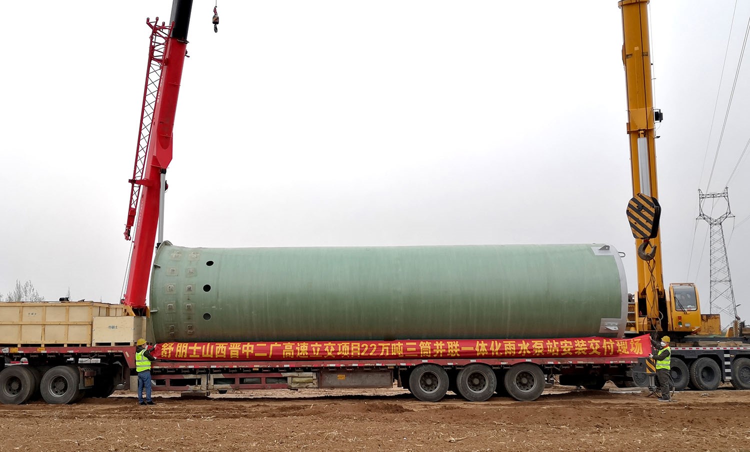 目前项目正在井然有序地进行施工,三个庞然大物已经吊装完毕,成功坐落在项目现场。舒朋士泵站完善了晋中二广高速下立交排水系统的构建,并将在投入使用后为解决当地雨水排涝,保障市民安全顺畅出行做出巨大的贡献。